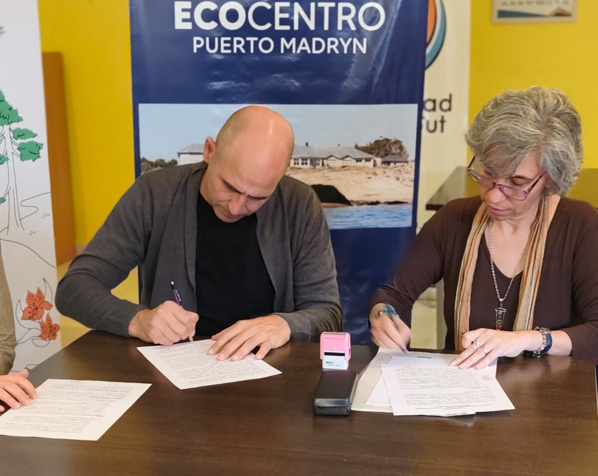 El acuerdo fue rubricado por Diego González, presidente del Ecocentro Puerto Madryn, y por la Dra. Marcela Inés Freytes Frey, rectora de la Universidad del Chubut.